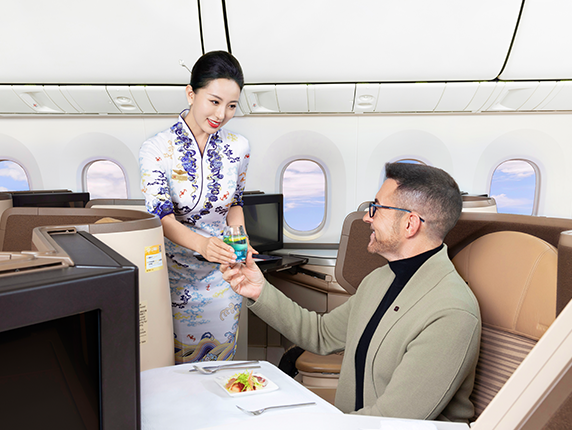 我們的專屬廚師團(tuán)隊(duì),將在客艙及自營貴賓室內(nèi)通過特色貔貅餐具、專屬菜單,為您提供兼顧國際標(biāo)準(zhǔn)與中國飲食特色的餐飲,讓您盡享全球美味。