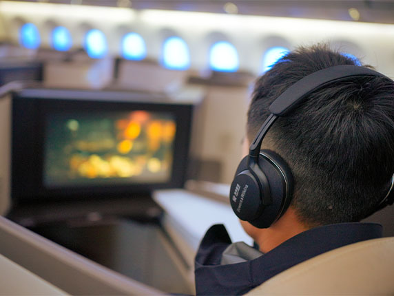 在機(jī)上,我們?yōu)槟峁┮幌盗芯烙捌半娨暪?jié)目,配合公務(wù)艙頭戴式降噪耳機(jī),讓您在空中奢享原音,沉浸聆聽(tīng),洗卻疲憊,享受旅途。